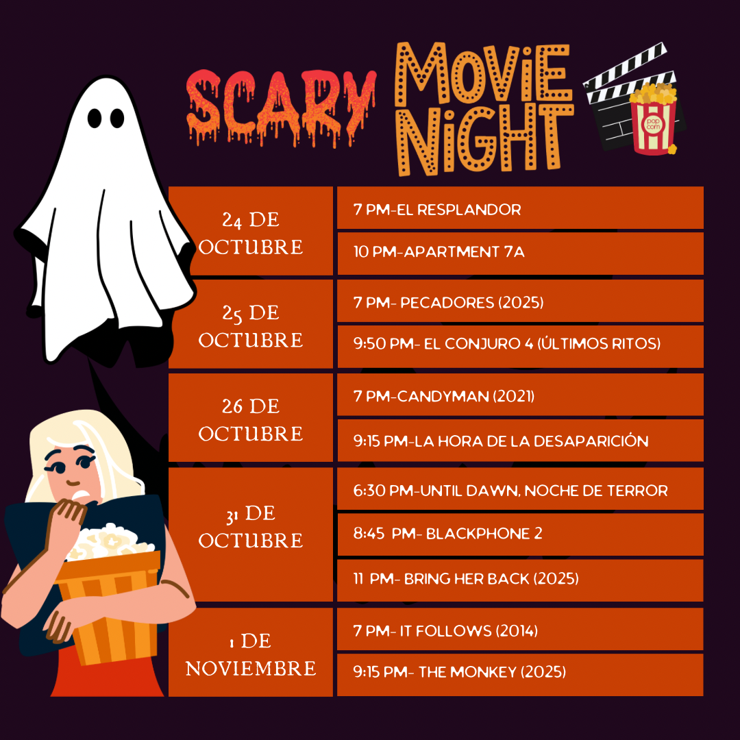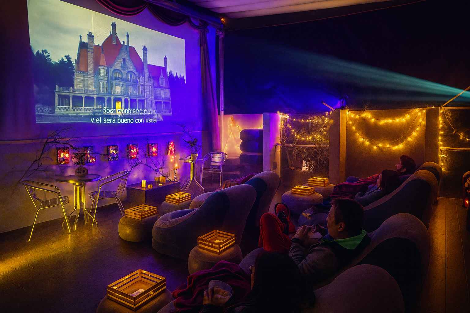 Proyección de cine en nuestro Rooftop Cinema Club embrujado, con ambientación de Halloween, sillones inflables y cobijita bajo la luna. Menú temático de Halloween y bebidas especiales 🧪